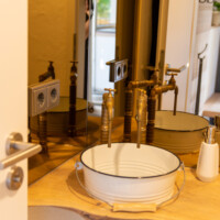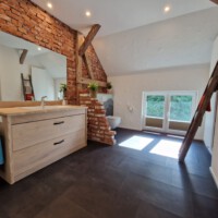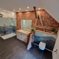 Das Dachgeschoss bietet ein schönes Badezimmer mit Regendusche, großem Waschtisch und WC . Nebenan ist ein Abstellraum mit Waschmaschine, Trockner, Bügelbrett, Bügeleisen usw.
