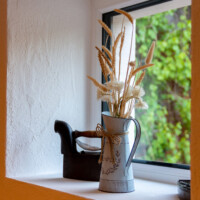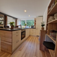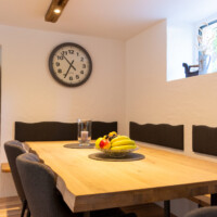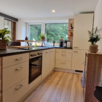 Im Erdgeschoss befindet sich ein kleiner Flur, WC und eine gut ausgestattete Küche mit gemütlichem Ess- und Wohnbereich.